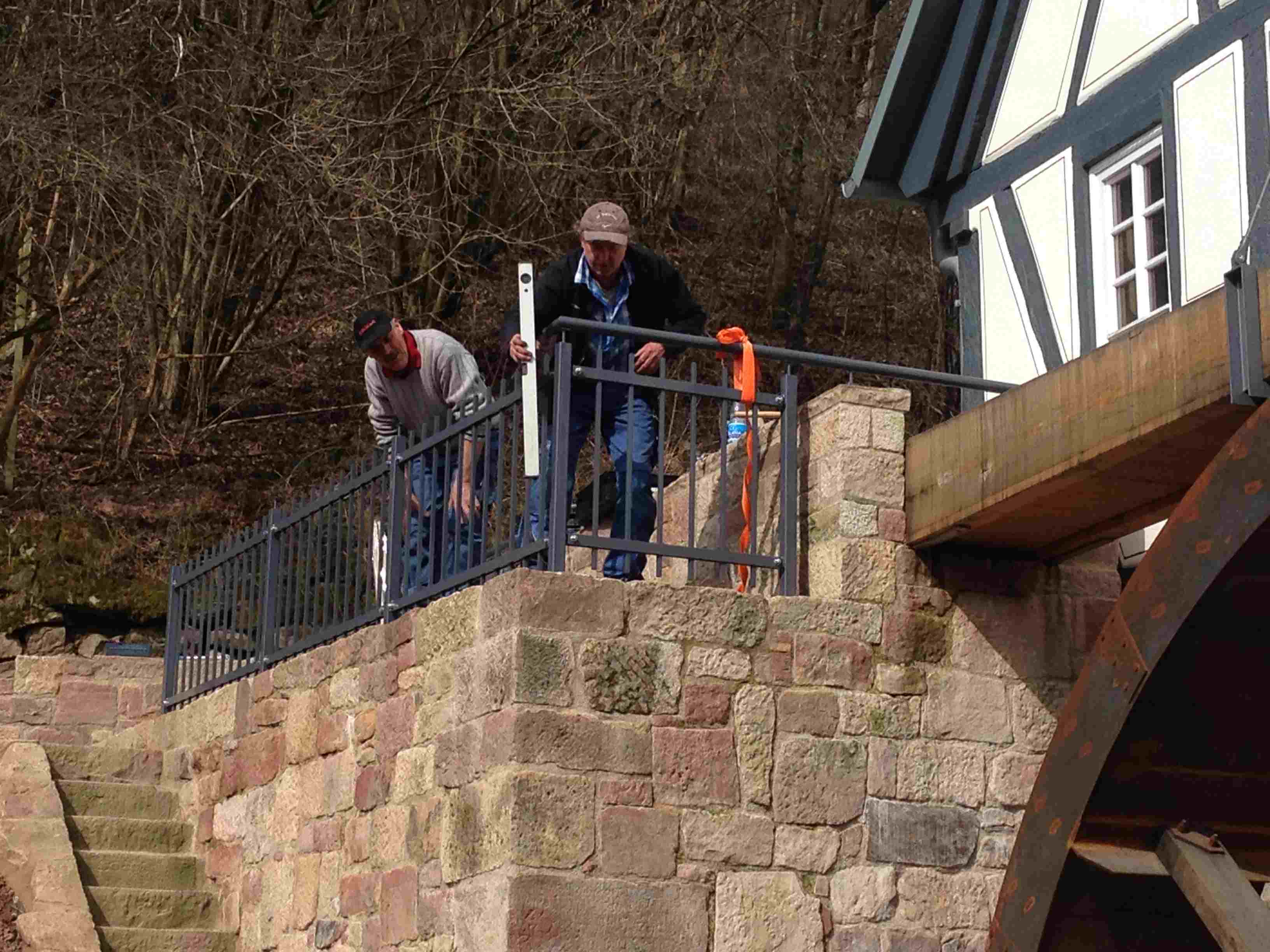 Eigentlich soll es darum gehen, dass Helmut und Albrecht das Geländer um die Mühle bauen. An dem Wort „Geländer“ bin ich aber irgendwie hängen geblieben. Ein seltsames Wort, man kann es sich gar nicht richtig herleiten. Anders als zum Beispiel „Handlauf“ – übrigens eines meiner Lieblingsworte. Das Internet sagt, es stamme aus dem 14. Jahrhundert und sei von dem mittelhochdeutschen Wort „Lander“ abgeleitet. Und Lander sei das Wort für Stangenzaun gewesen. Diese Information lässt mich aber auch einigermaßen ratlos zurück: warum Lander und nicht Stangezaun? Aber: „Ein vil edel magedin lehnet an ein lander“ klingt eigentlich ganz schön mittelhochdeutsch.